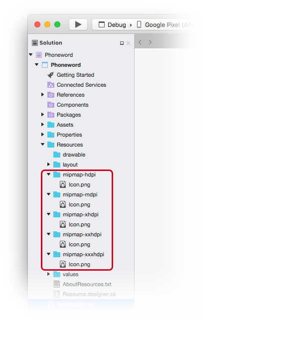 Ahora es el momento de establecer el icono de la aplicación. De forma predeterminada, Visual Studio para Mac proporcionará un icono predeterminado para el proyecto. Elimine estos archivos de la solución y reemplácelos por otro icono. Expanda la carpeta Recursos en Panel de solución. Observe que hay cinco carpetas que tienen el prefijo mipmap- y que cada una de estas carpetas contiene un archivo Icon.png: