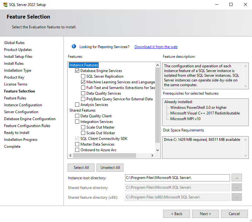 Servicios de motor de base de datos: para usar las extensiones de lenguaje con SQL Server, debe instalar una instancia del motor de base de datos. Puede usar una instancia predeterminada o una con nombre.