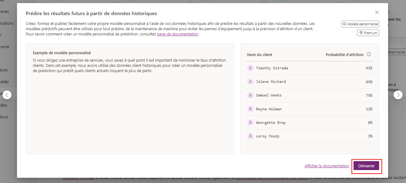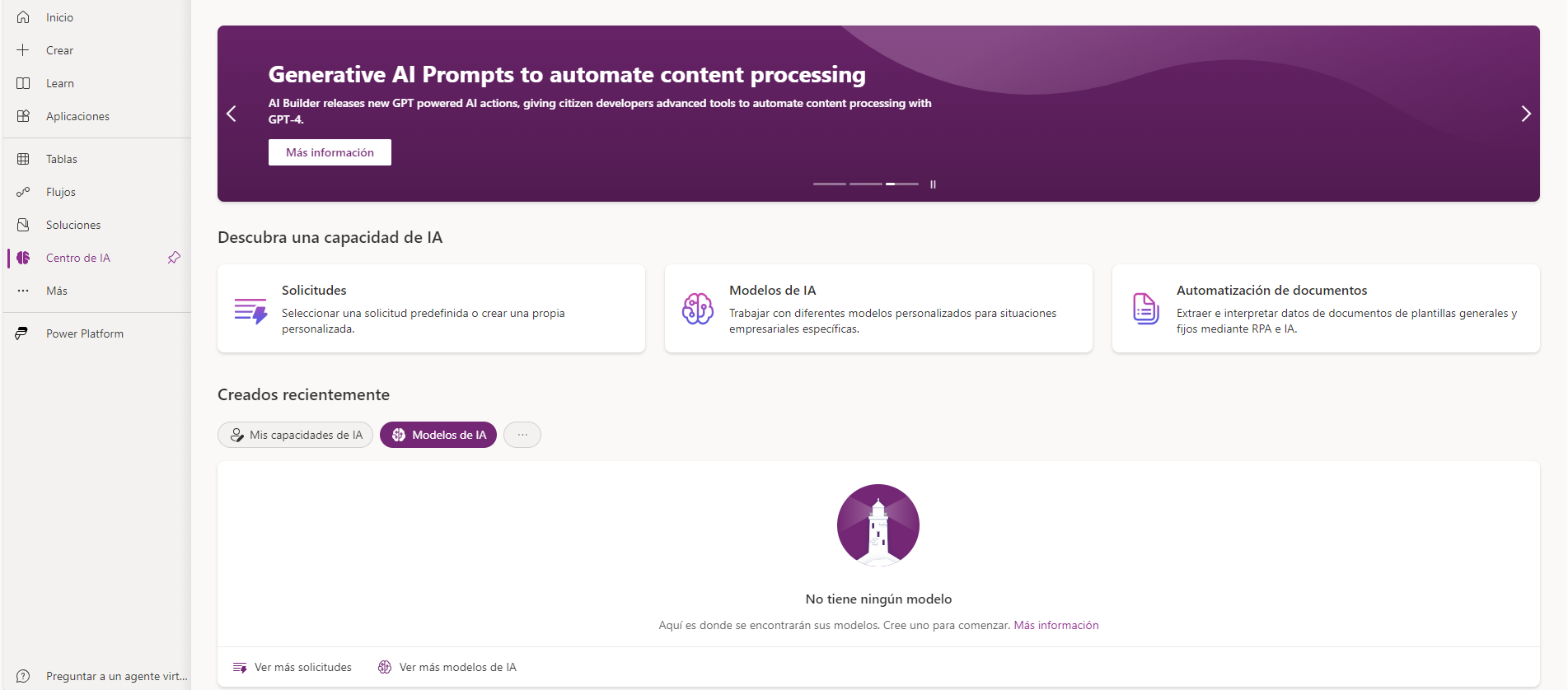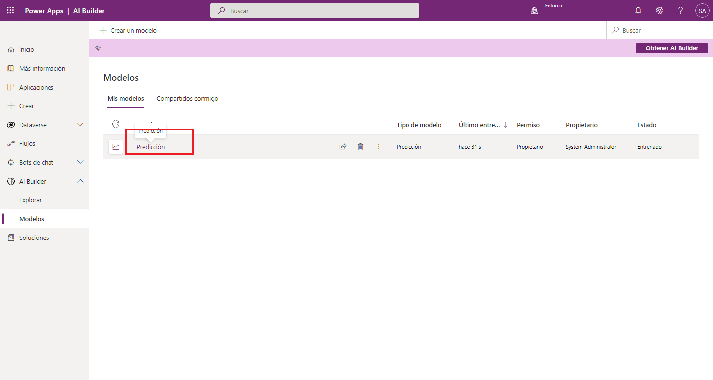 En Estudio de Microsoft Power Apps, en el menú de navegación izquierdo, en Centro de IA, seleccione Modelos de IA y, luego, seleccione el modelo de predicción.