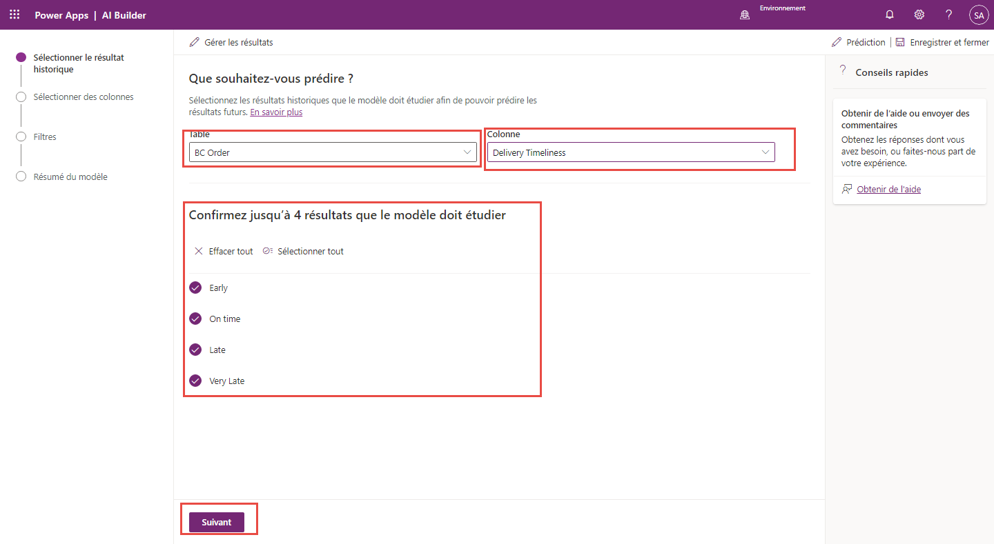 Seleccione la tabla Pedido de BC y la columna Puntualidad de entrega. Confirme los cuatro resultados que estudiará el modelo y luego seleccione Siguiente.