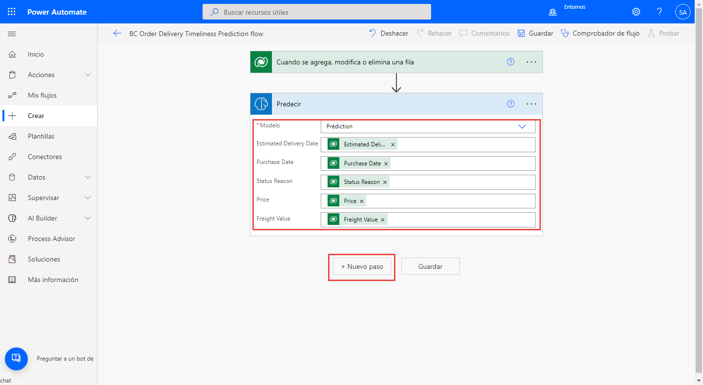Seleccione el modelo de predicción que creó para este ejercicio. Para cada valor solicitado por el modelo, seleccione la columna adecuada de la tabla Pedido de BC. Después, seleccione Nuevo paso para crear una acción.