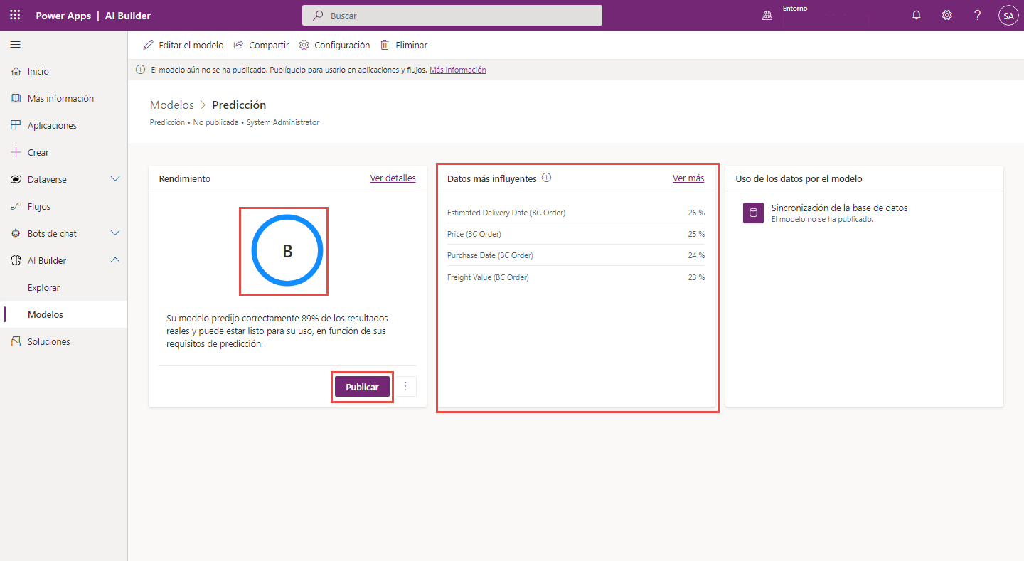Revise los detalles de rendimiento. Para este ejercicio, el nivel B es satisfactorio. Los datos más influyentes proporcionarán información sobre las columnas que tienen el mayor impacto en la determinación del resultado. Seleccione Publicar pasar al siguiente paso de este ejercicio.