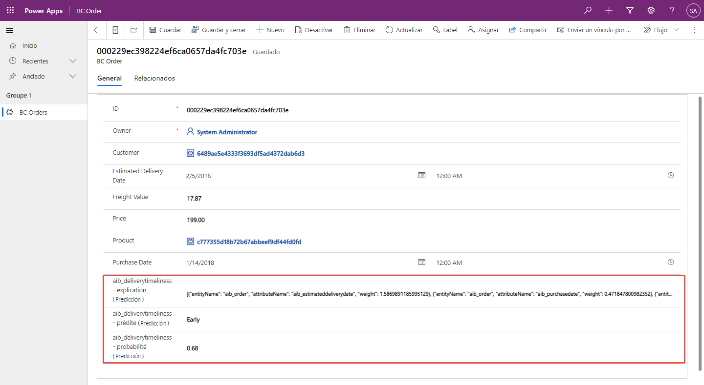 Ahora ha creado con éxito un modelo de predicción. Además, ha creado un flujo de nube de Power Automate que genera el análisis de resultados cuando se agregan nuevas filas a la tabla Pedido de BC.