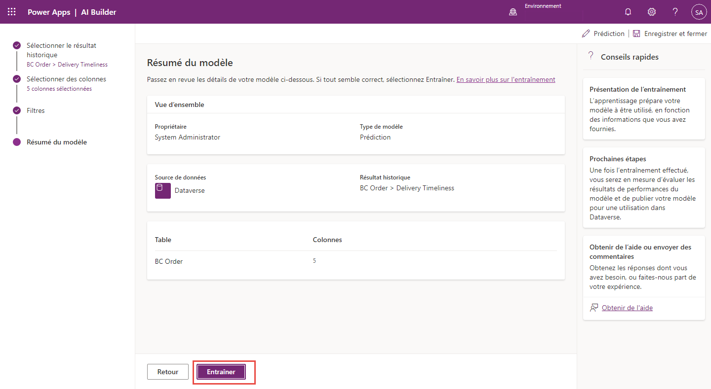 Revise el Resumen de modelo. Seleccione Entrenar para pasar a la siguiente parte de este ejercicio.