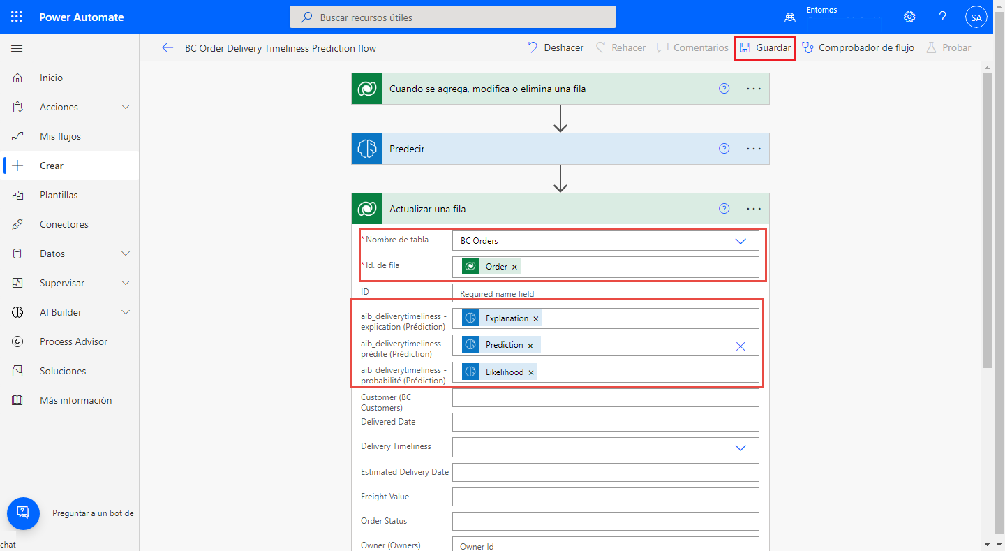 En el menú desplegable Nombre de tabla, seleccione Pedido de BC. En el campo Id. de fila, proporcione el identificador único del desencadenador. Introduzca Explicación, Predicción y Probabilidad desde la acción Predecir como los otros valores requeridos. Luego, seleccione Guardar para completar la creación del flujo.