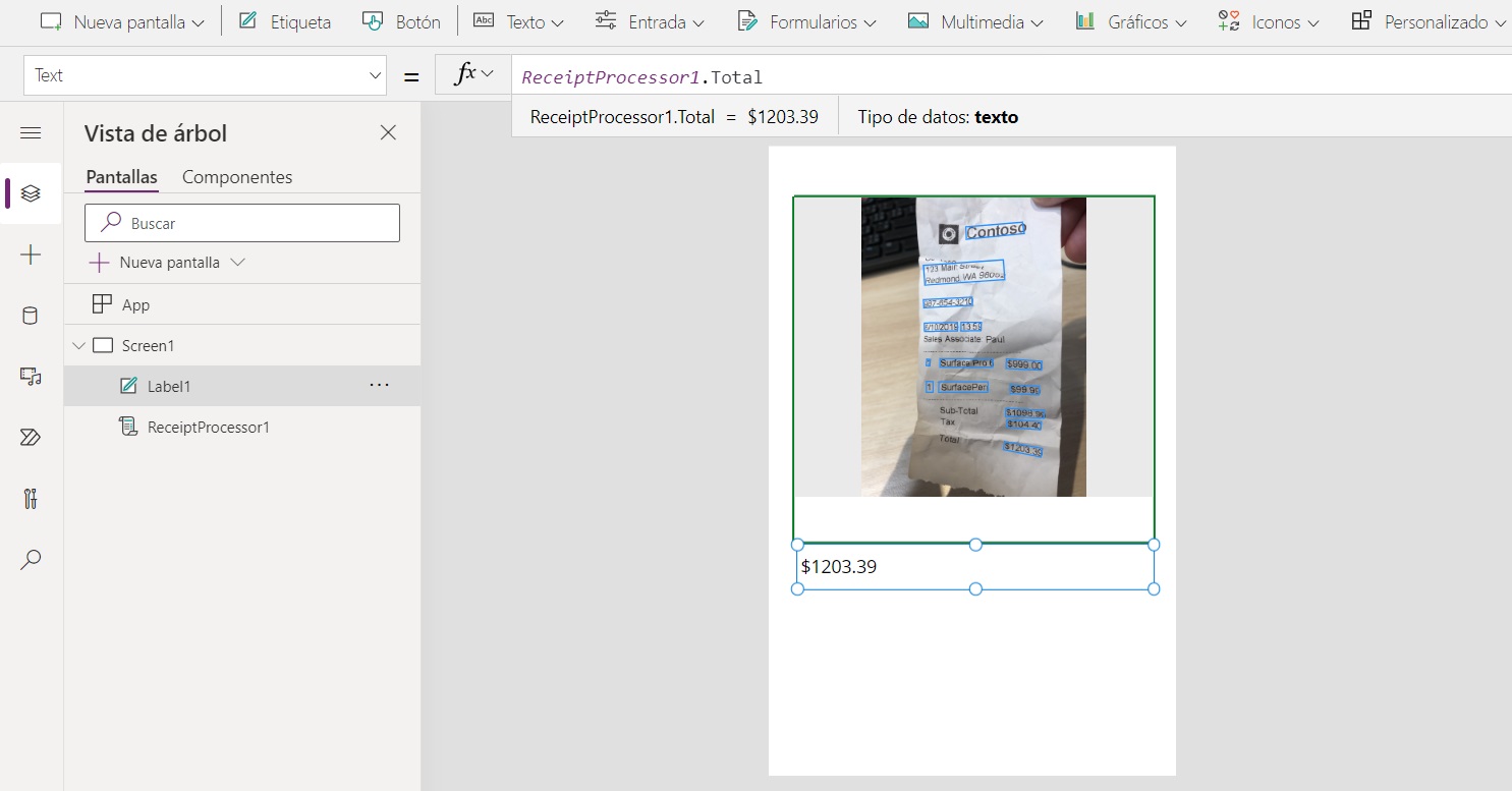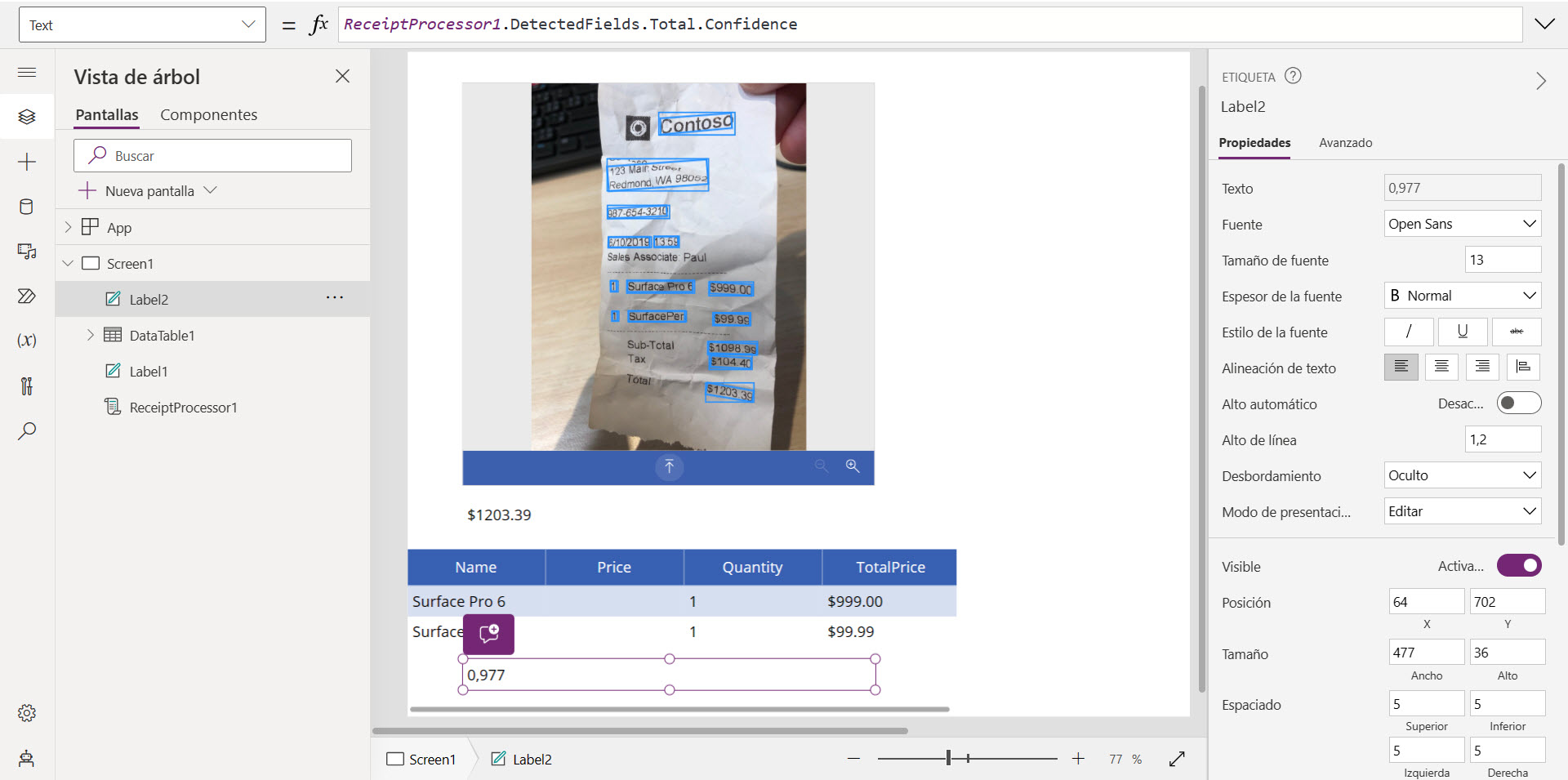 Una vez que haya seleccionado el componente de etiqueta recién creado, establezca la propiedad Text usando la barra de fórmulas para la propiedad DetectedFields.Total.Confidence del componente Procesador de recibos.