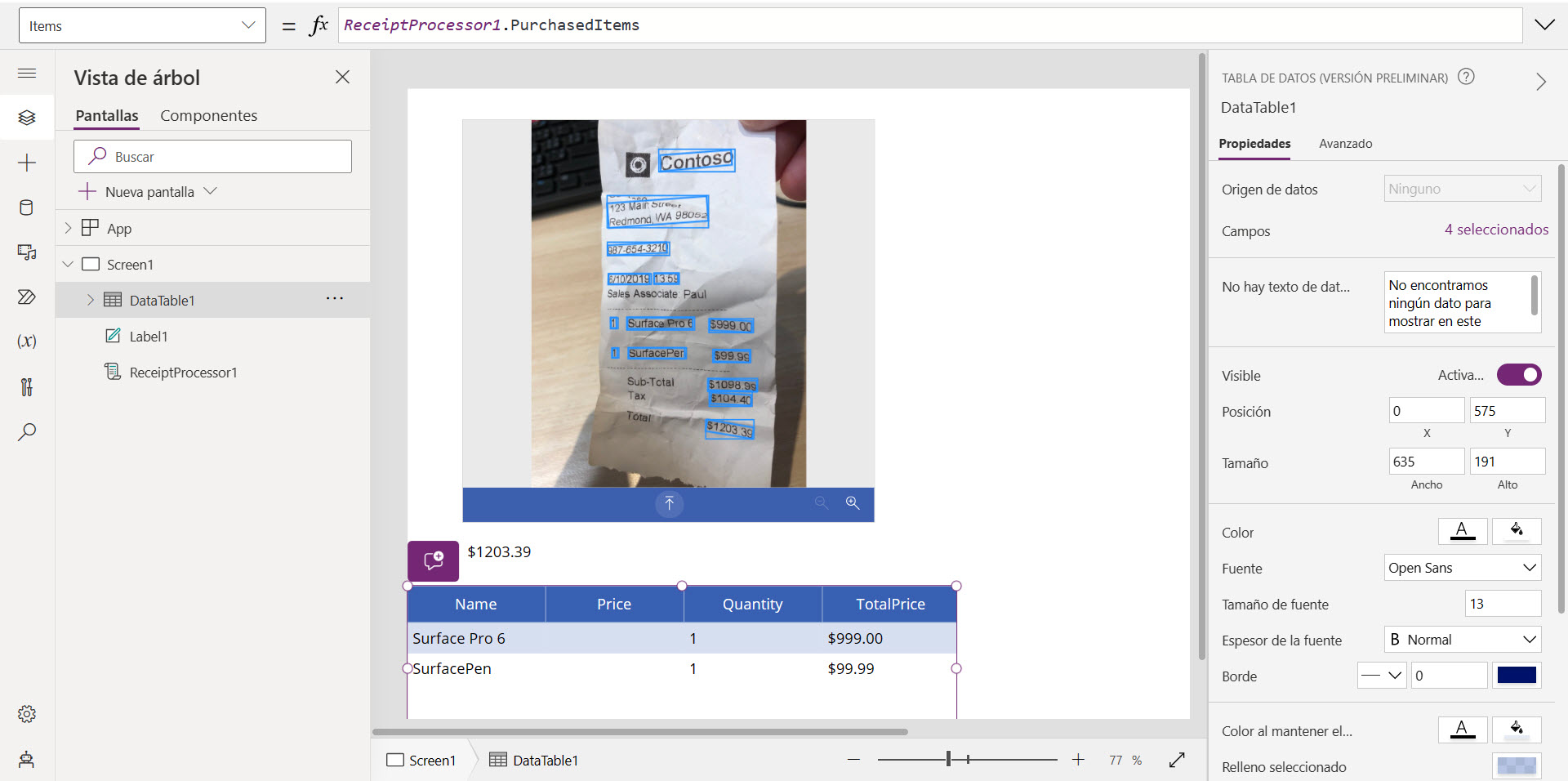 Cuando haya seleccionado el componente de etiqueta de datos recién creado, establezca la propiedad Items usando la barra de fórmulas para la propiedad PurchasedItems del componente Procesador de recibos.
