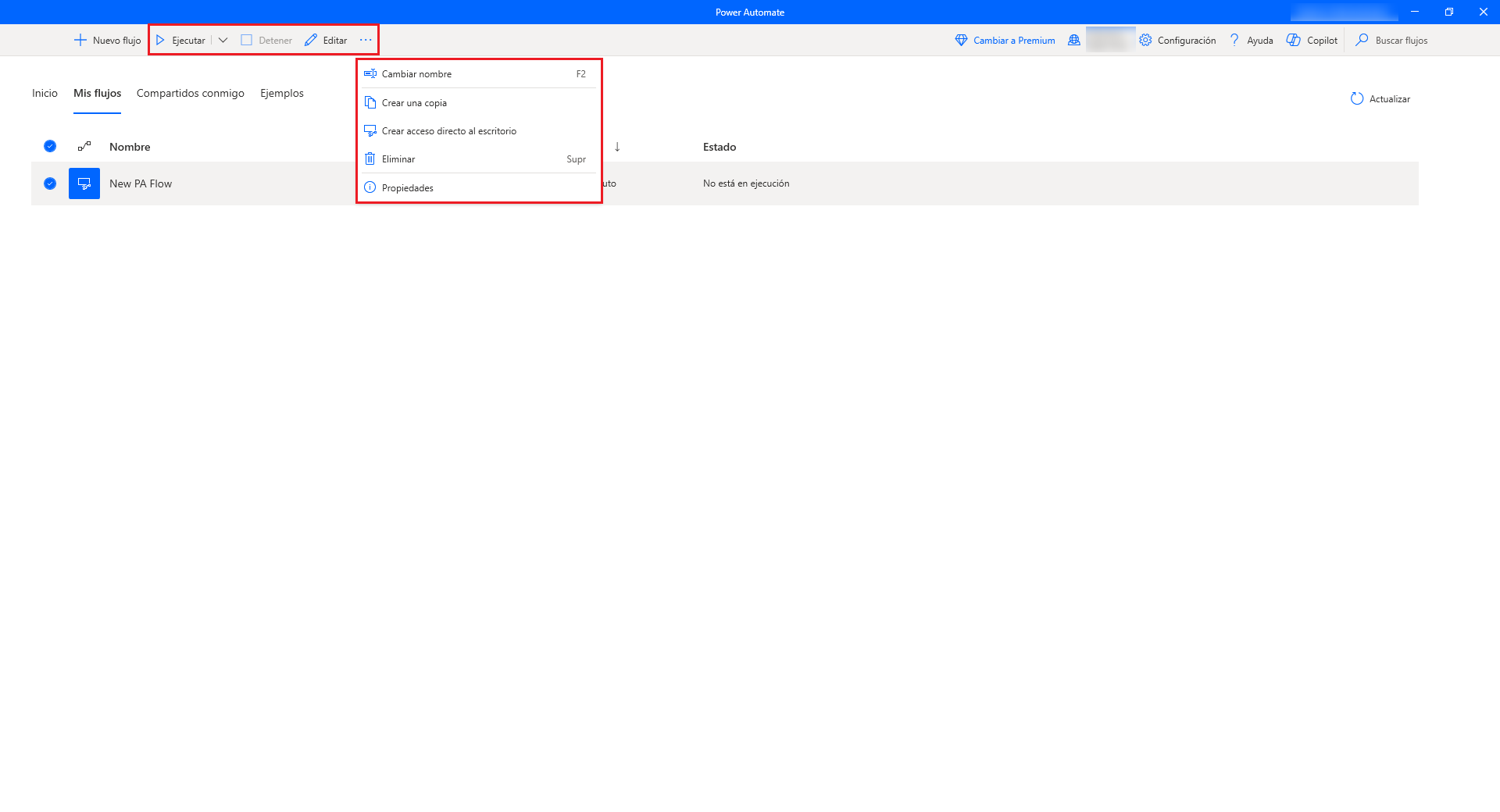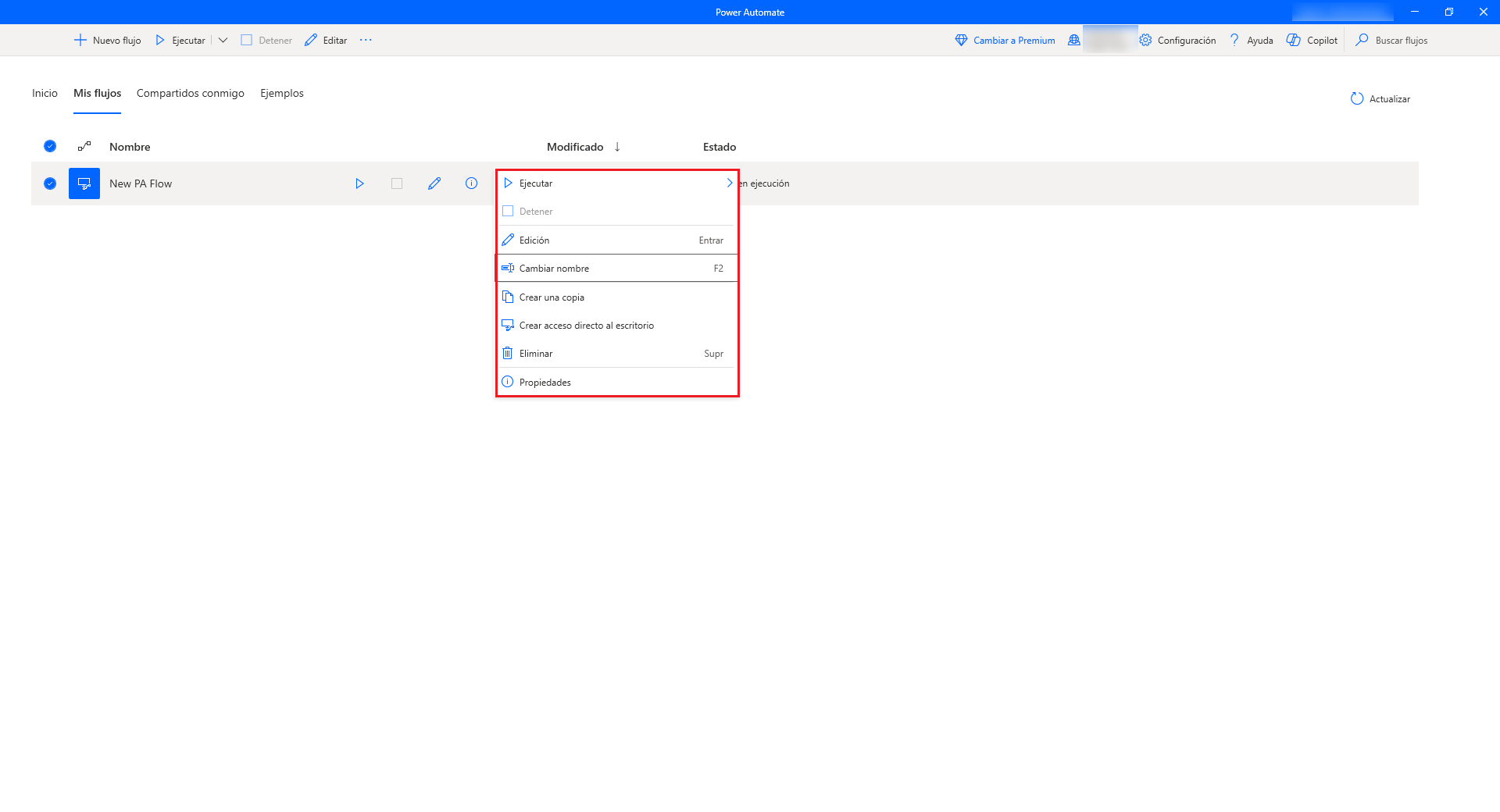 Para gestionar un flujo existente, haga clic con el botón derecho en él y elija entre iniciarlo, editarlo, cambiarlo de nombre o eliminarlo. Si el flujo se está ejecutando actualmente, dispone de una opción más para detenerlo.