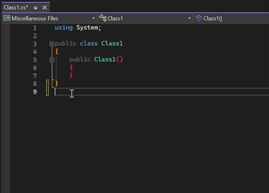 Si no quiere ver el constructor vacío que se generó para Class1, puede contraerlo para despejar la vista del código. Seleccione el signo de intercalación en el margen de la primera línea del constructor. O bien, si prefiere usar el teclado, coloque el cursor en cualquier lugar del código del constructor y seleccione las teclas Ctrl +M, Ctrl+M.