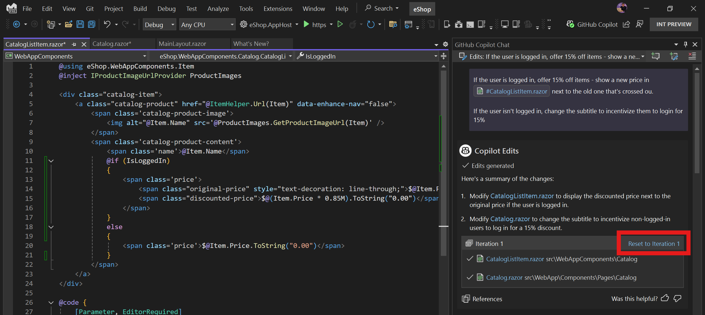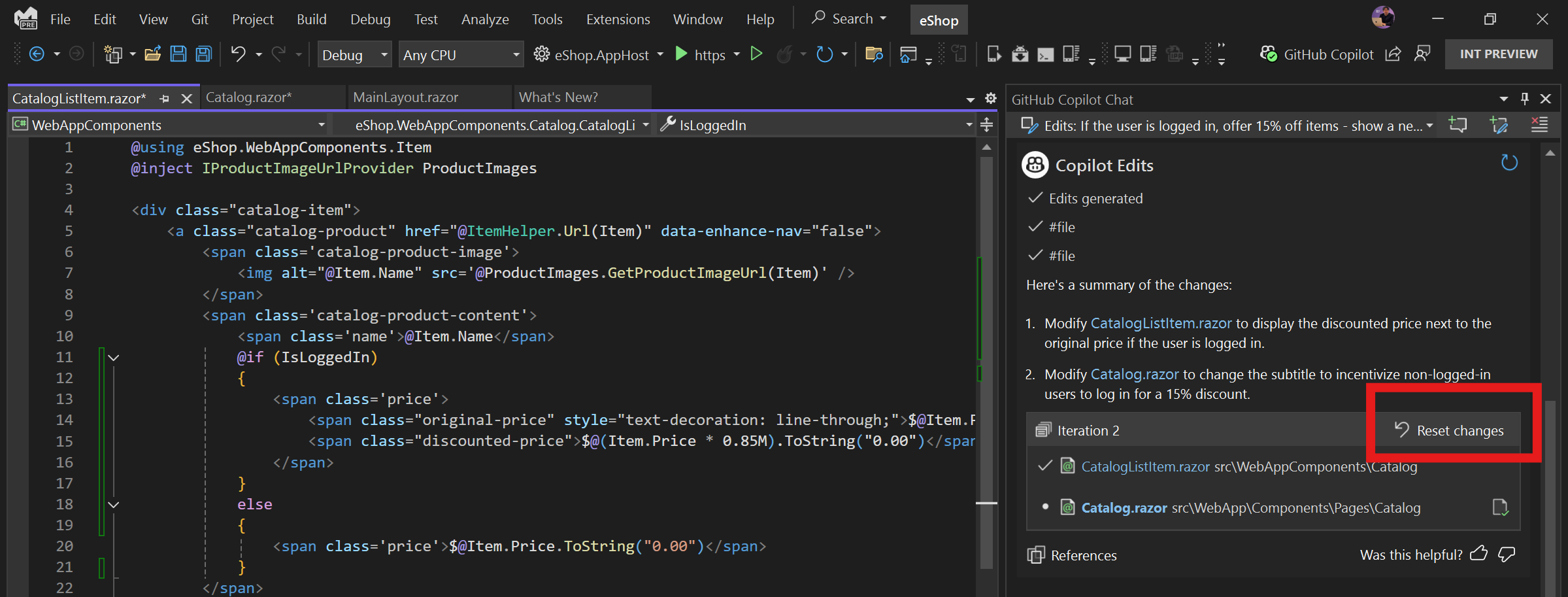 Mientras revisa los cambios en el archivo, podría aceptar o rechazar una propuesta de código por error. Si es así, seleccione Restablecer cambios para restablecer los archivos enumerados a su estado antes de generar la iteración.