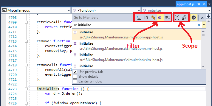 De forma predeterminada, se busca el elemento especificado entre todos los elementos de la solución. Sin embargo, puede limitar la búsqueda de código a tipos de elementos específicos precediendo los términos de búsqueda con determinados caracteres. También puede cambiar rápidamente el filtro de búsqueda seleccionando botones en la barra de herramientas del cuadro de diálogo Ir a . Los botones que cambian los filtros de tipo se encuentran en el lado izquierdo y los botones que cambian el ámbito de la búsqueda se encuentran en el lado derecho: