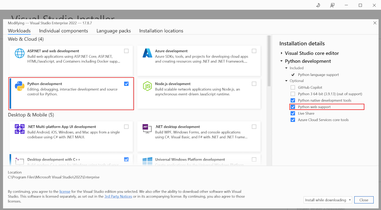 Si necesita instalar Visual Studio, vaya a Descargas de Visual Studio para instalarlo de forma gratuita. En el Instalador de Visual Studio, seleccione la carga de trabajo Desarrollo de Python . En el panel de detalles de instalación, seleccione Compatibilidad web de Python.