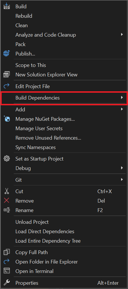 Lo que ve en el menú contextual del nodo Project también depende del tipo de proyecto, el lenguaje de programación o la plataforma. La siguiente captura de pantalla resalta una opción adicional para una aplicación de C#: un menú emergente de Dependencias de compilación. Las opciones adicionales suelen aparecer cuando se agrega otro proyecto a una solución y, a continuación, se agregan a un repositorio.