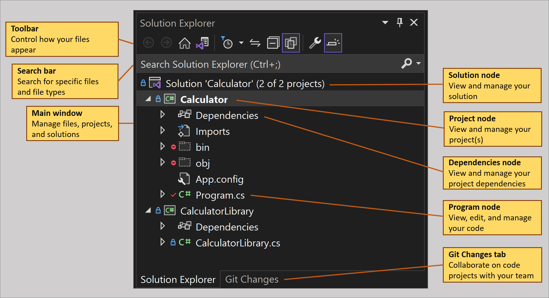 Echemos un vistazo a la ventana de herramientas del Explorador de soluciones y su interfaz de usuario (interfaz de usuario). Comenzaremos con una captura de pantalla anotada de una solución de consola de C# abierta que tiene dos proyectos.