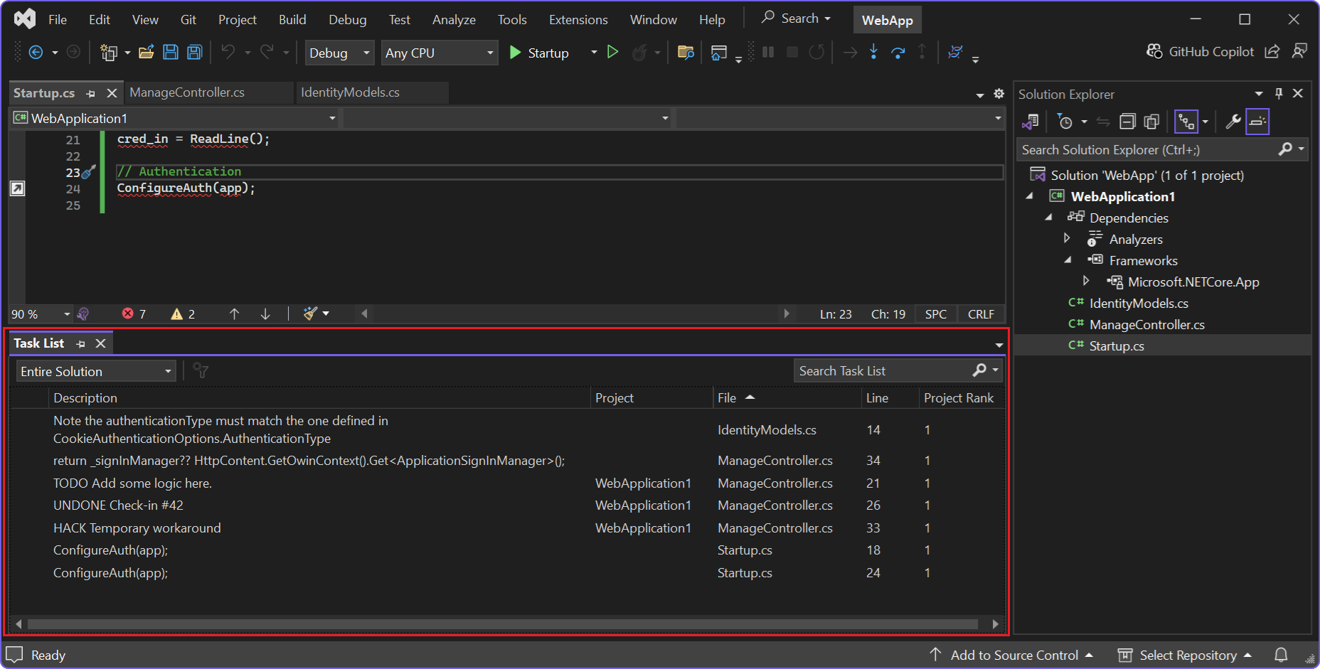 La herramienta de lista de tareas de Visual Studio le permite realizar un seguimiento de los comentarios de código que usan tokens como TODO y HACK o tokens personalizados. También puede usar esta función para administrar los accesos directos de tareas que le llevan directamente a una ubicación predefinida en el código. De forma predeterminada, lista de tareas se abre en la parte inferior de la ventana de la aplicación en el entorno de desarrollo interactivo (IDE) de Visual Studio: