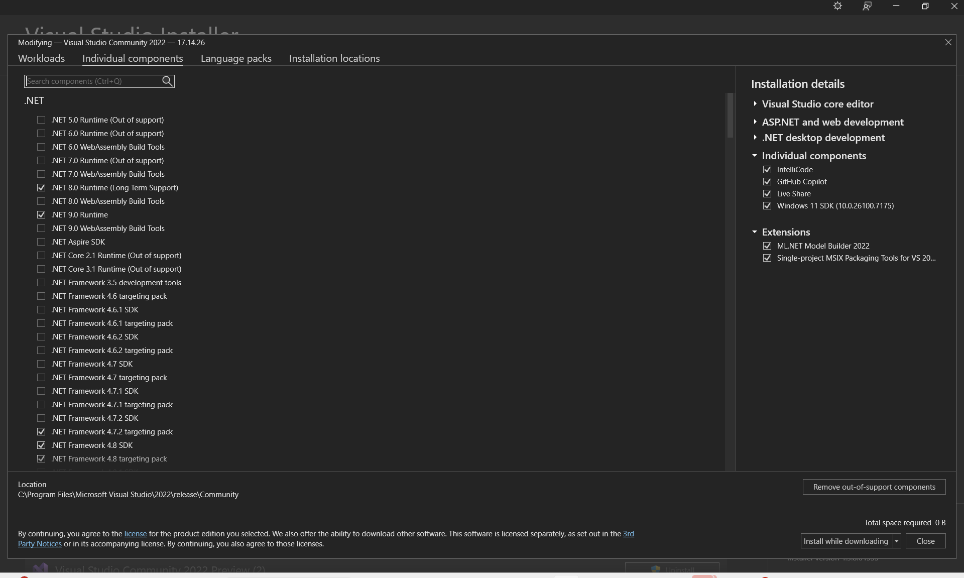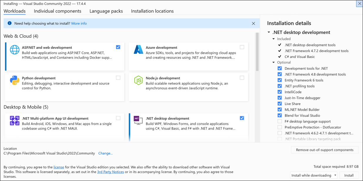 Después de elegir las cargas de trabajo que desee, seleccione Instalar.