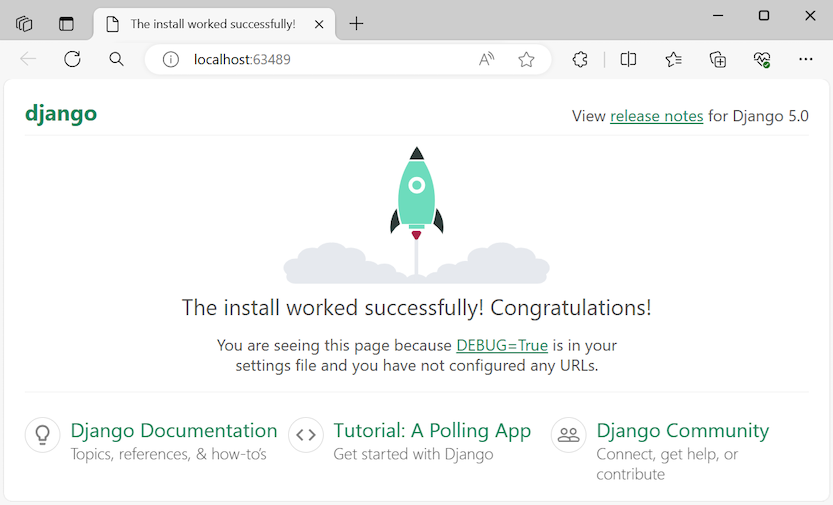 http://localhost:<port>. Dado que el proyecto de Django no tiene aplicaciones, Django muestra solo una página predeterminada para confirmar que el código actual funciona según lo previsto.Cuando haya terminado, cierre la ventana de la consola, que detiene el servidor de desarrollo de Django. También puede seleccionar Depurar>Detener la depuración.