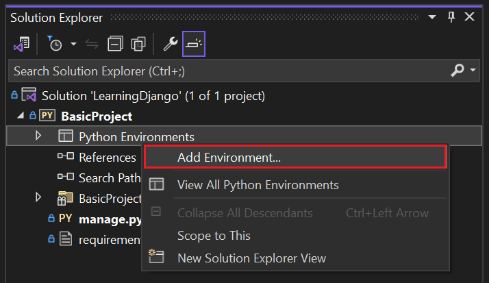 En el Explorador de soluciones, haga clic con el botón derecho en el nodo Entornos de Python y seleccione Agregar entorno.