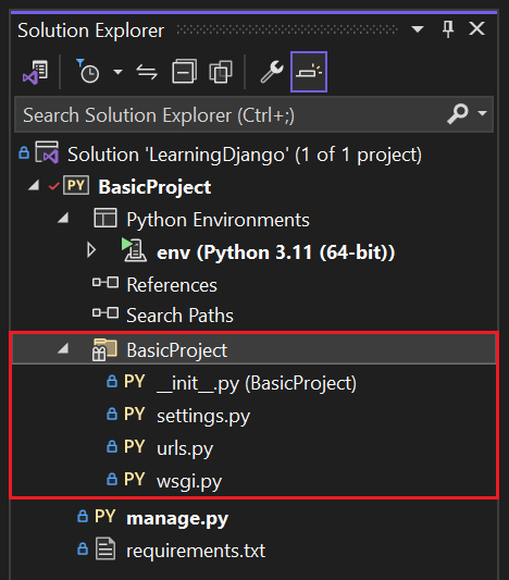 Abra Explorador de soluciones para ver los archivos de la solución y del proyecto. El proyecto inicial contiene solo dos archivos, manage.py y requirements.txt: