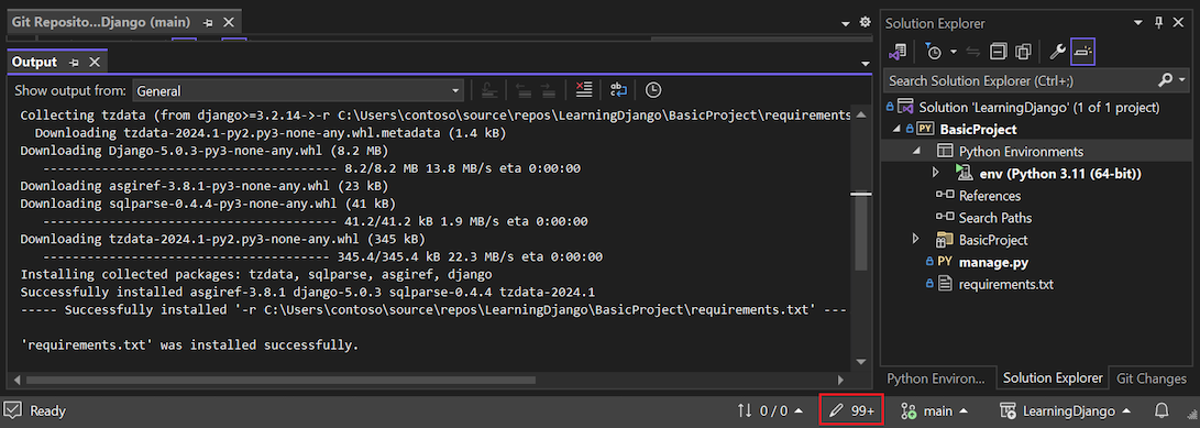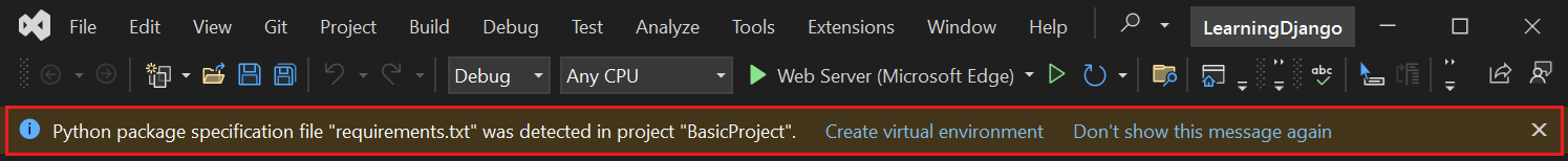 Después de un momento, Visual Studio muestra el mensaje se detectó el Archivo de especificación del paquete de Python "requirements.txt" en el proyecto "BasicProject":