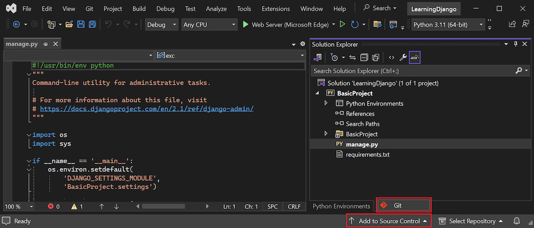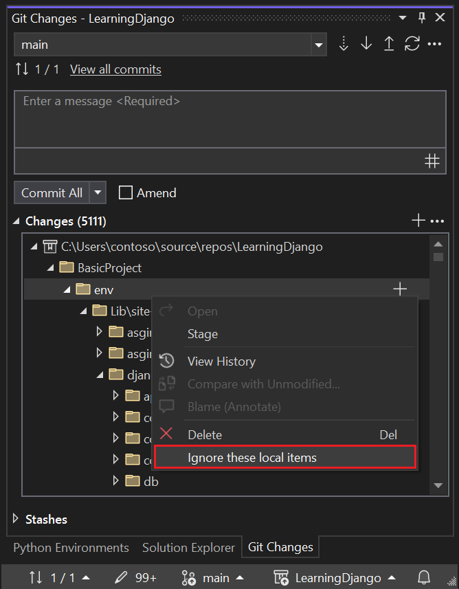 Después de configurar el control de código fuente para el proyecto, puede crear el entorno virtual con los paquetes de Django necesarios que requiere el proyecto. A continuación, puede usar la ventana Cambios de Git para excluir la carpeta del entorno del control de código fuente.