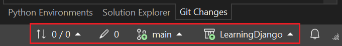 De izquierda a derecha, la barra de controles de Git muestra el número de confirmaciones salientes o entrantes (flechas #/#), el número de cambios no confirmados (lápiz #), el nombre de la rama actual y el nombre del repositorio actual. Los controles git también están disponibles en el menú git de la barra de herramientas principal.