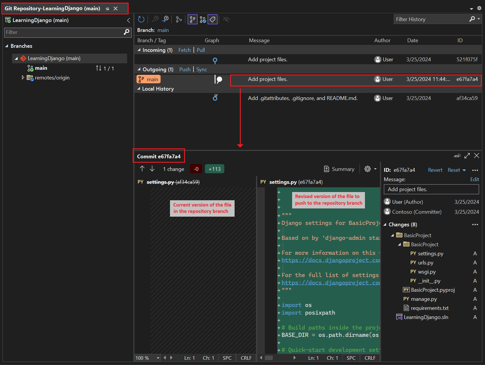 Puede abrir la ventana del repositorio de Git y confirmar que las confirmaciones almacenadas provisionalmente se muestran en el historial local de la rama actual.