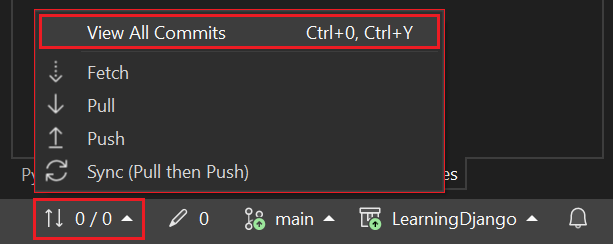 En la barra de controles de Git, seleccione las confirmaciones (flechas #/#) y, a continuación, seleccione Ver todas las confirmaciones: