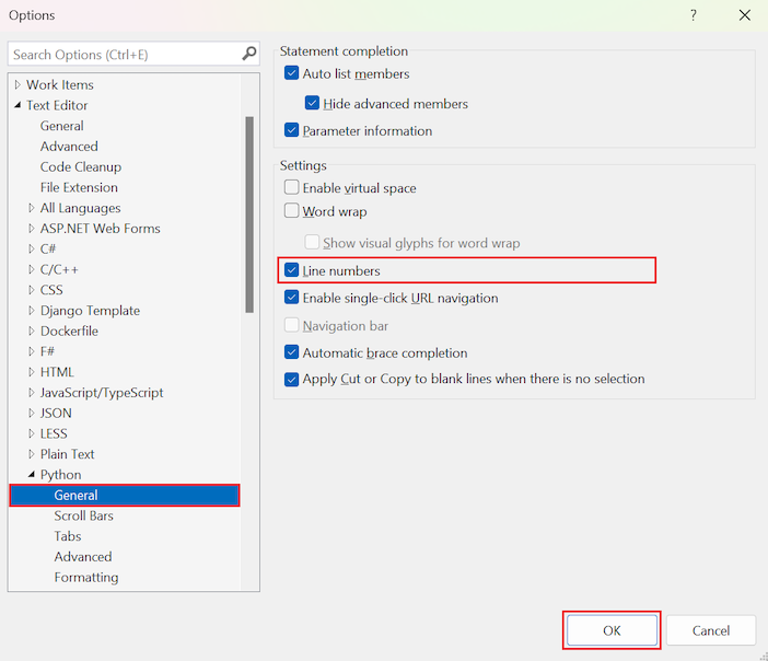 De forma predeterminada, los números de línea no aparecen en el editor. Para ver los números de línea, seleccione >, expanda la sección Todos los >de configuración>>General y seleccione la opción Números de línea:
