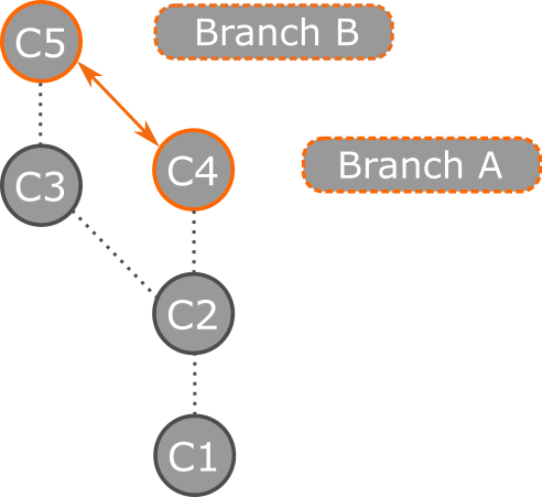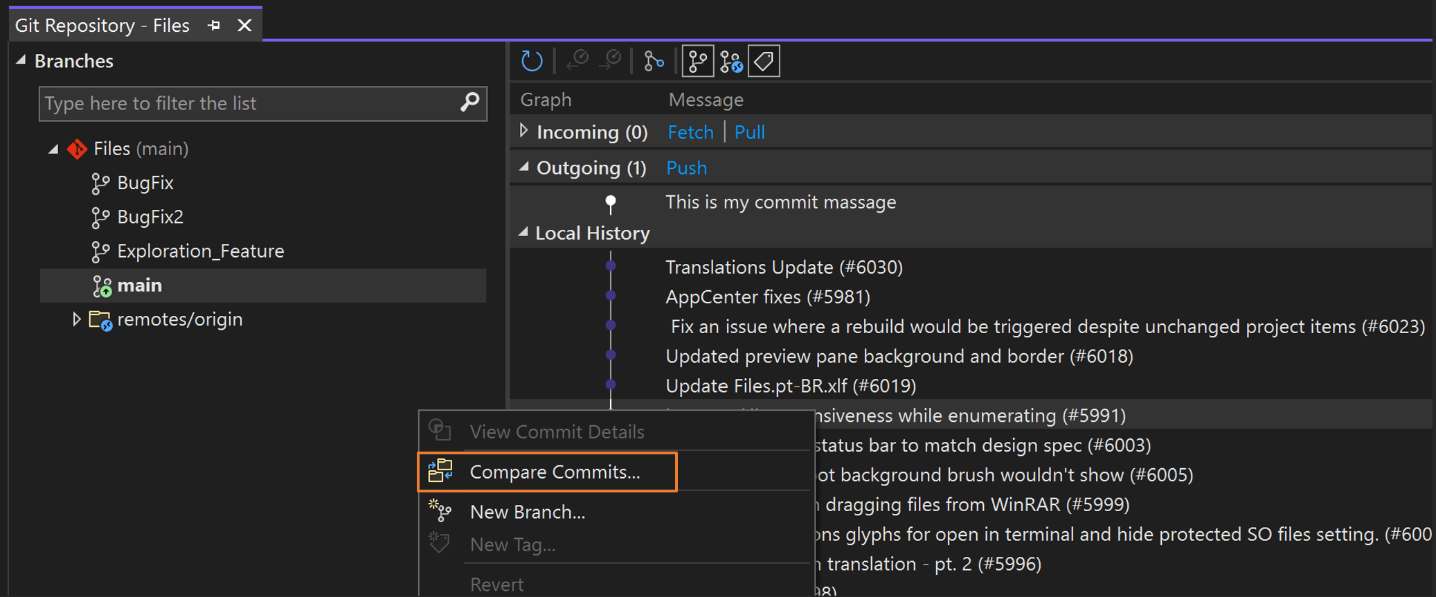 Para comparar las dos confirmaciones de la rama, use la tecla Ctrl para seleccionar las dos confirmaciones que desea comparar. A continuación, haga clic con el botón derecho en uno de ellos y seleccione Comparar confirmaciones.