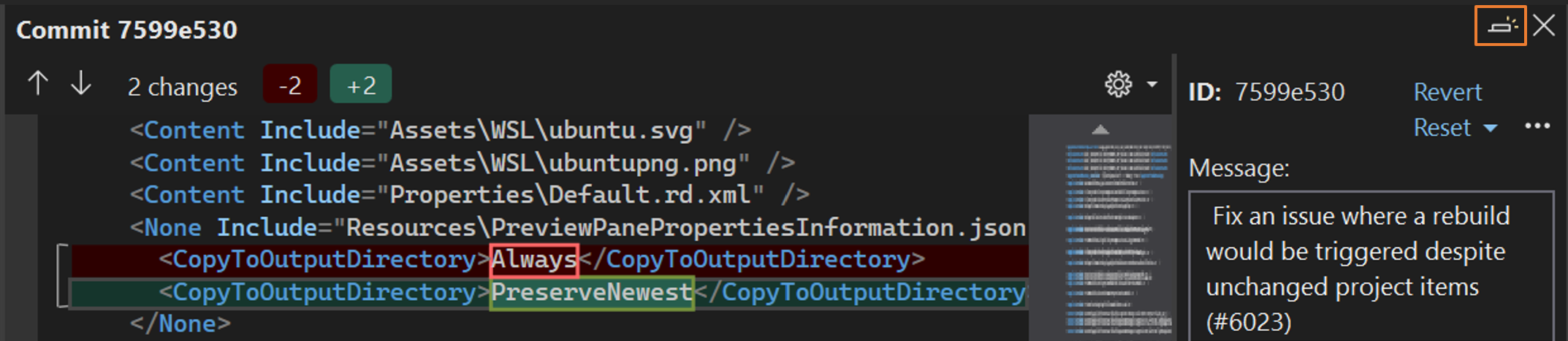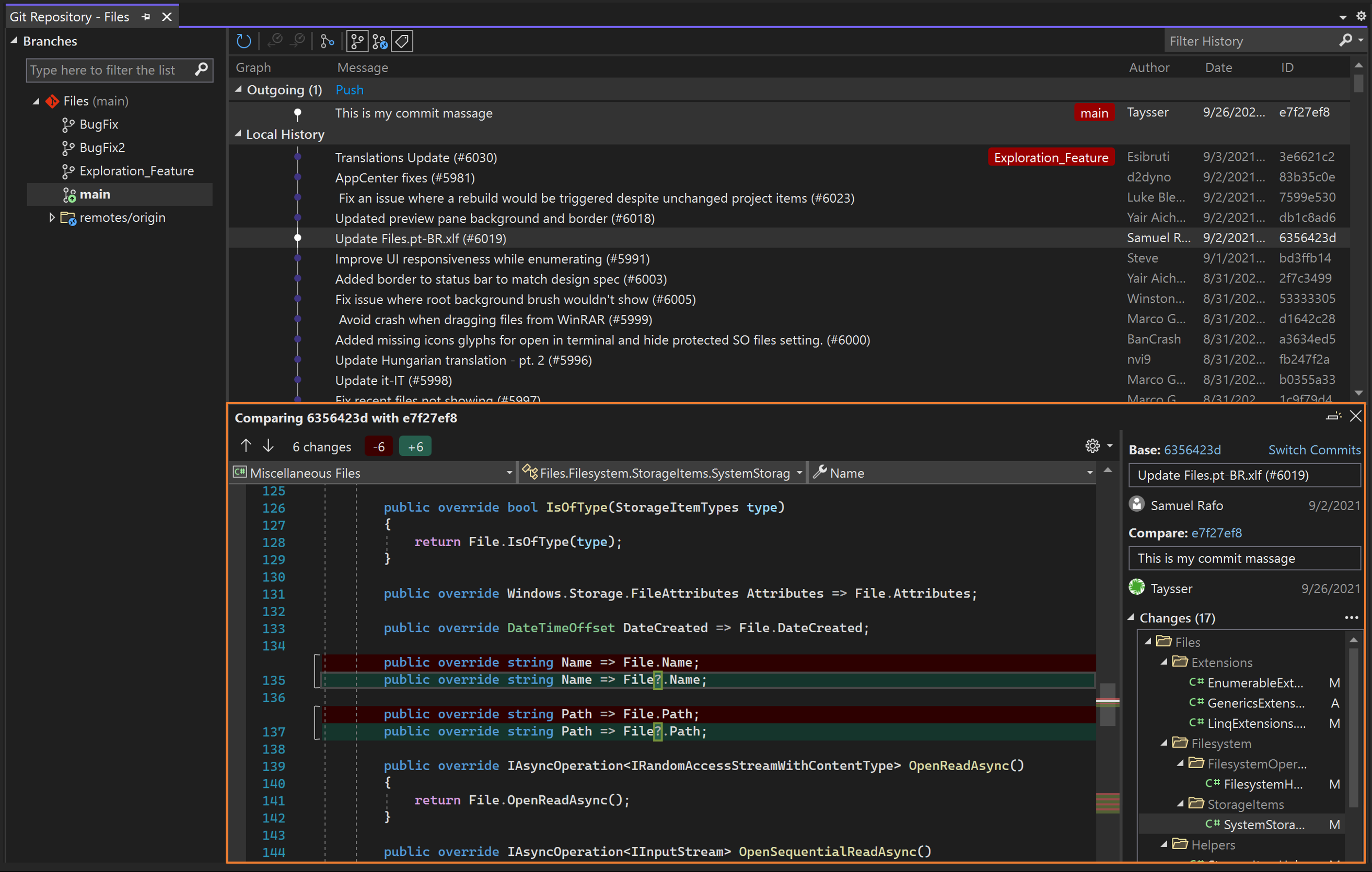 Confirmar: para abrir esta sección, seleccione cualquier confirmación en la sección Graph . Puede comprobar los cambios que un commit ha introducido seleccionándolos, lo que mostrará las diferencias. Por ejemplo, en la captura de pantalla anterior se muestran los cambios que se han introducido en el archivo Resize.cs .