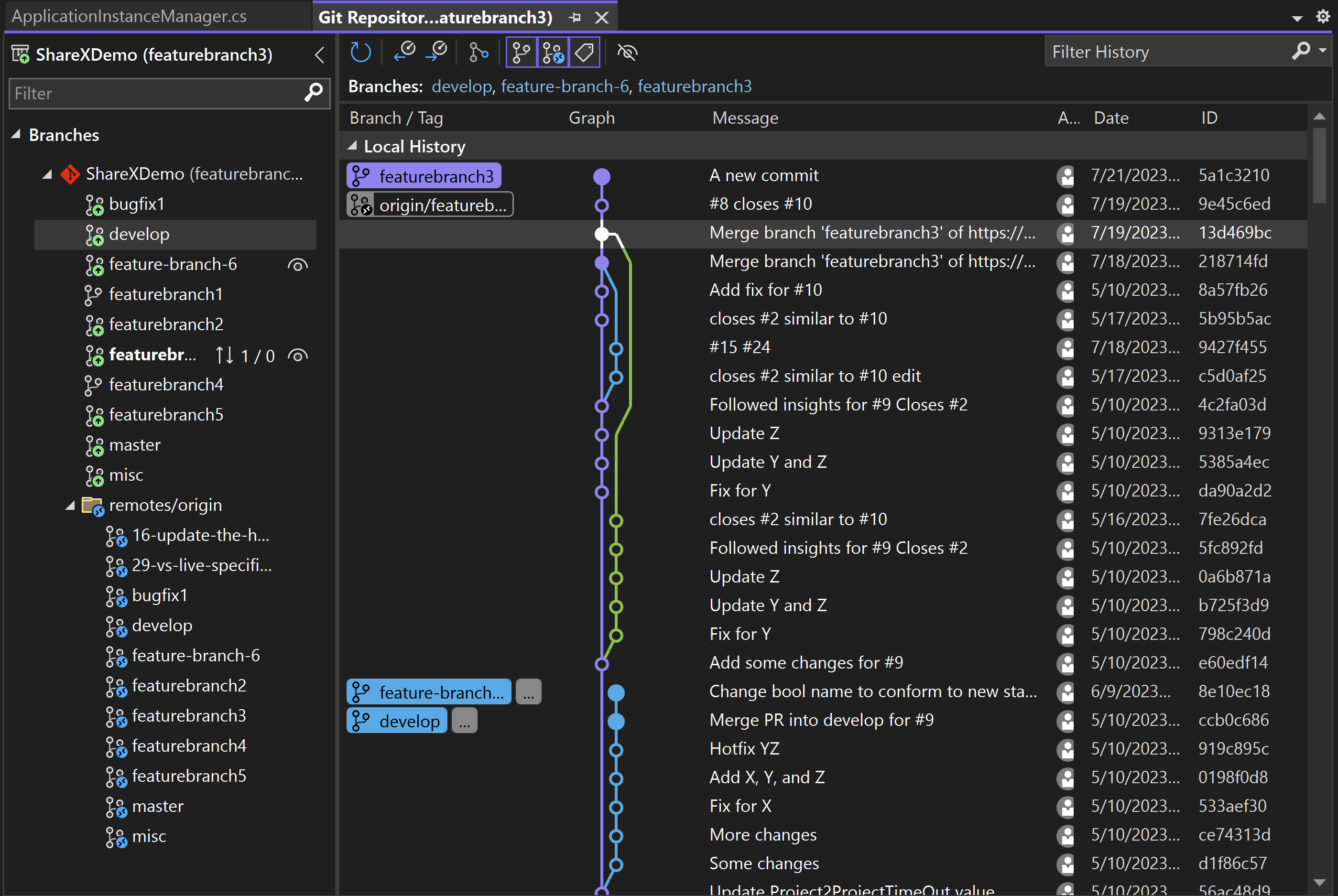 Novedad de la versión 17.7: al abrir la ventana Repositorio de Git, se inicia en la vista de rama única. A continuación, puede seleccionar cualquier rama para agregar la rama y sus confirmaciones a una vista del historial de varias ramas, que agrega indicaciones visuales que hacen que sea más eficaz interactuar con varias ramas.