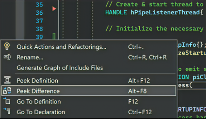 También puede acceder a Peek Difference cuando haga clic con el botón derecho en una línea de código que tenga cambios. Puede seleccionar Ver la diferencia en el menú contextual o usar el método abreviado de teclado Alt+F8.
