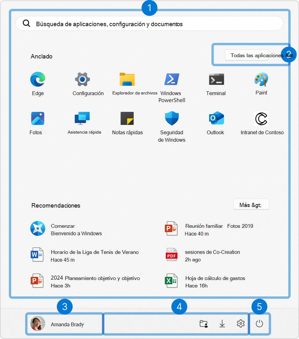 - La sección Recomendada está diseñada para mejorar la productividad del usuario al proporcionar acceso rápido a aplicaciones, documentos y sitios web usados con frecuencia.