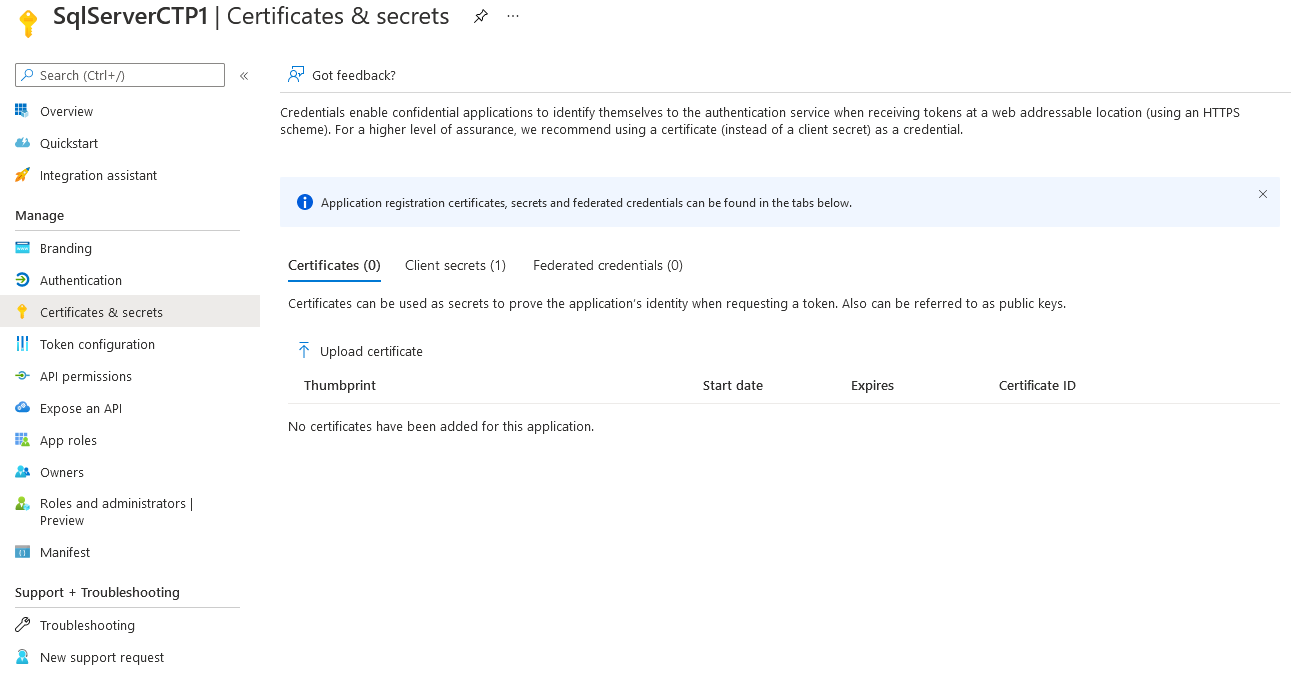 3. In the Azure portal, navigate to the app registration created above and select Certificates list