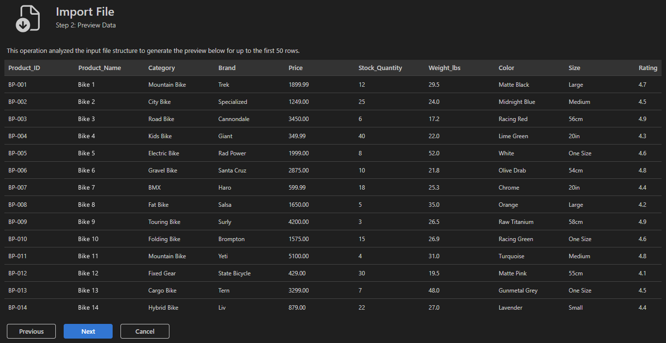 The wizard analyzes the input file and generates a preview of the data. It automatically infers column names and data types. Use this step to validate column alignment, delimiters, and data formatting.