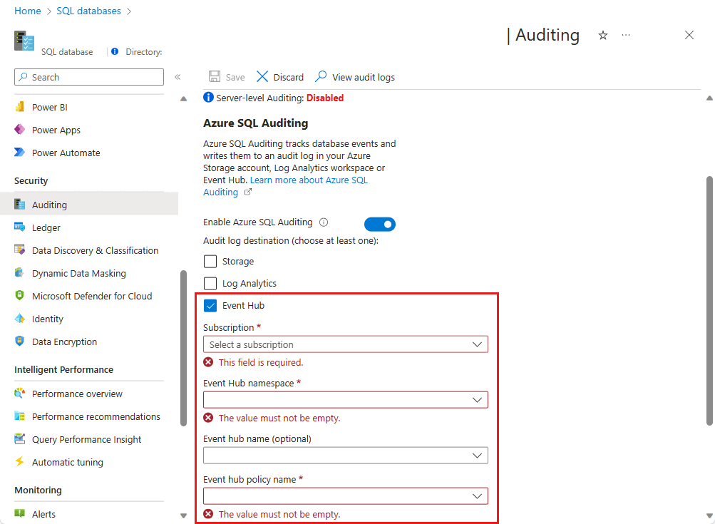 To configure writing audit logs to an event hub, select Event Hub. Select the event hub where you want logs stored, and then select Save. Be sure that the event hub is in the same region as your database and server.
