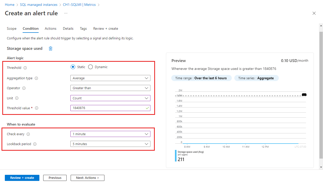 Field Description Check every Choose how often the alert rule checks if the condition is met. Lookback period Choose the lookback period, which is the time period to look back at each time the data is checked. For example, every 1 minute you'll be looking at the past 5 minutes. In the example shown in the screenshot, the value of 1,840,876 MB is used to represent a threshold value of 1.8 TB. As the operator in the example is set to greater than, the alert will be triggered if the storage space consumption on the SQL managed instance goes over 1.8 TB. The threshold value for storage space metrics must be expressed in MB.