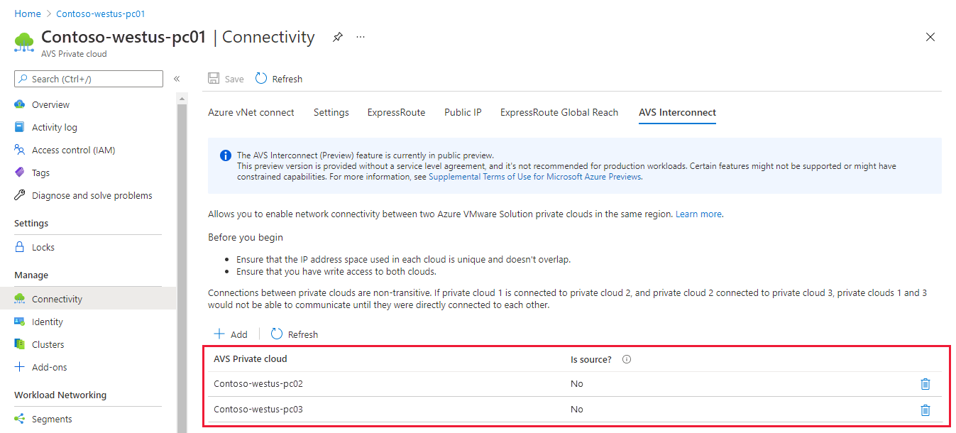 The AVS Interconnect feature lets you create a network connection between two or more Azure VMware Solution private clouds located in the same region. It creates a routing link between the management and workload networks of the private clouds to enable network communication between the clouds.