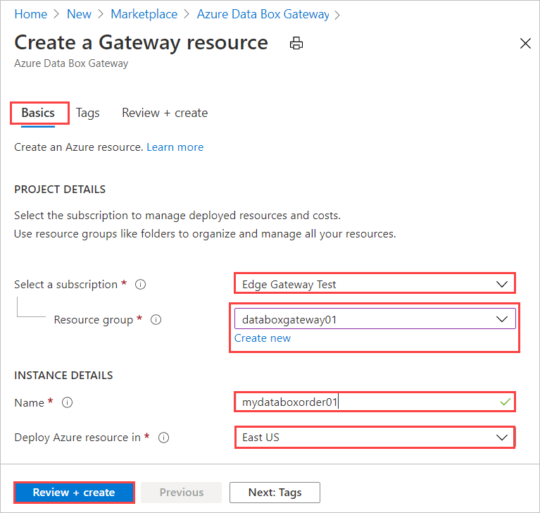 Setting Value Subscription Pick the subscription that you want to use for your Data Box Gateway device. The subscription is linked to your billing account. Resource group Select an existing group or create a new group.