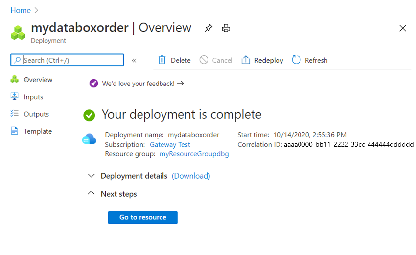 The resource creation takes a few minutes. After the resource is successfully created and deployed, you're notified. Select Go to resource.