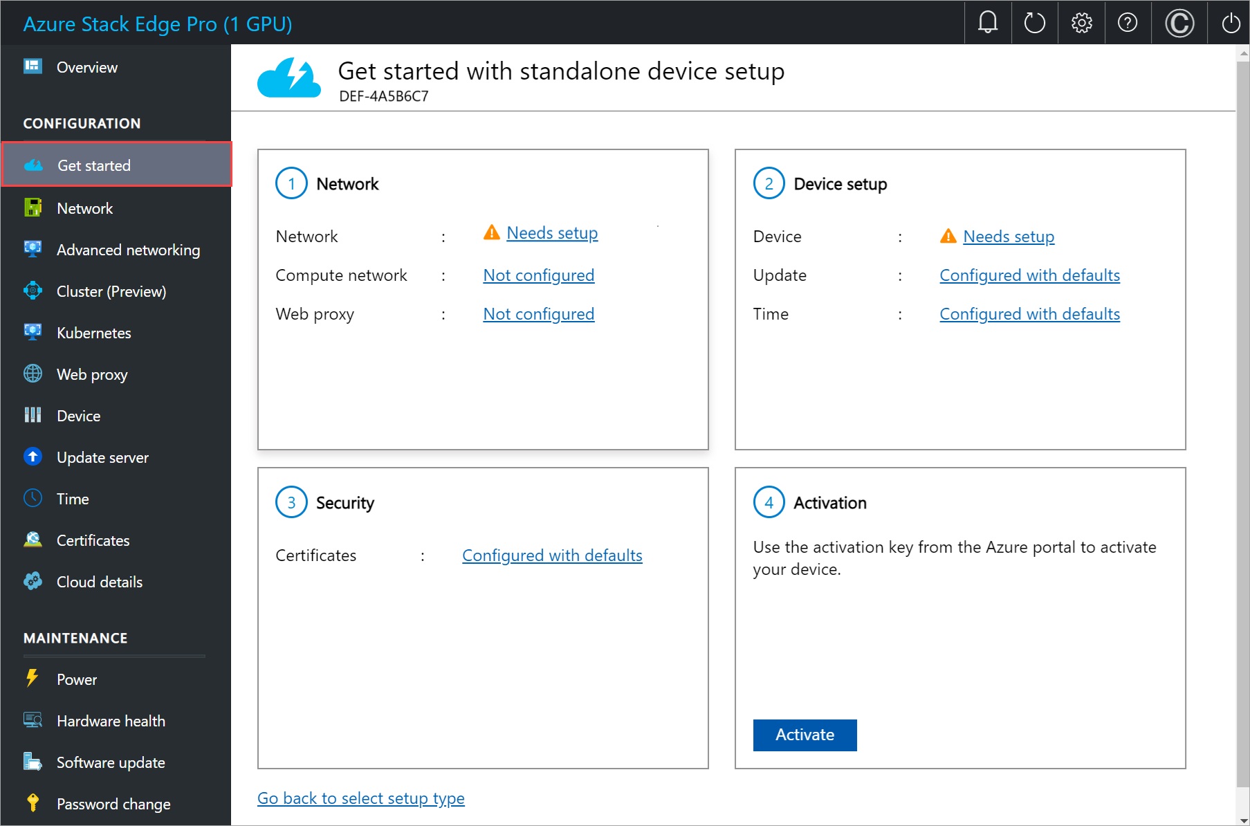 Your Get started page displays the various settings that are required to configure and activate the physical device with the Azure Stack Edge service.