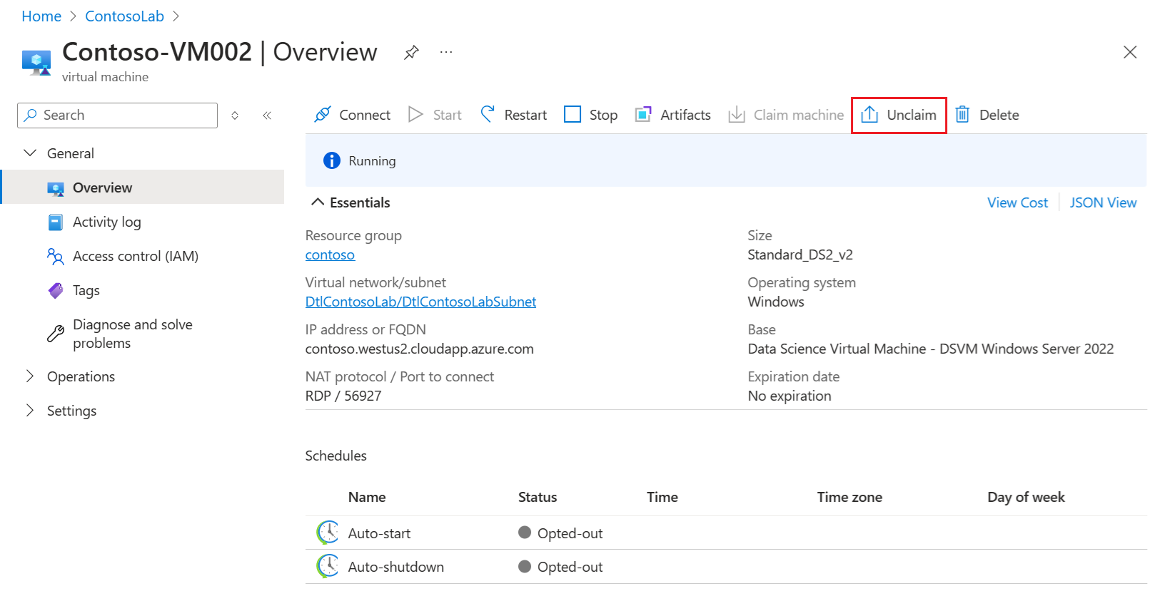 The user can also unclaim a virtual machine from the Overview page for the resource: