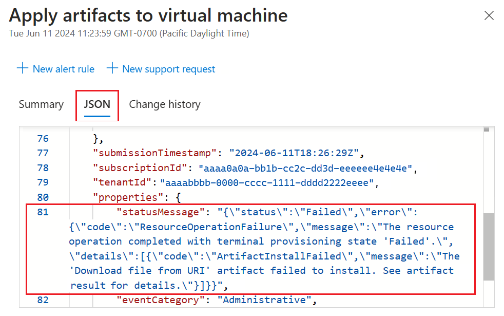 Go to the Artifacts list page for the lab VM, and select the artifact with the Failed status: