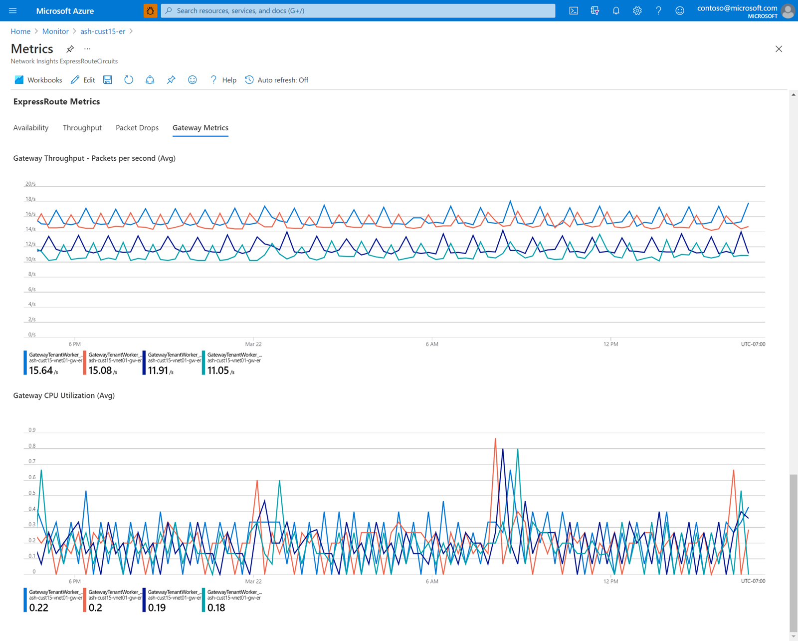 Lastly, the Gateway Metrics tab populates with key metrics charts for a selected ExpressRoute gateway (from the Linked Resources section). Use this tab when you need to monitor your connectivity to specific virtual networks.