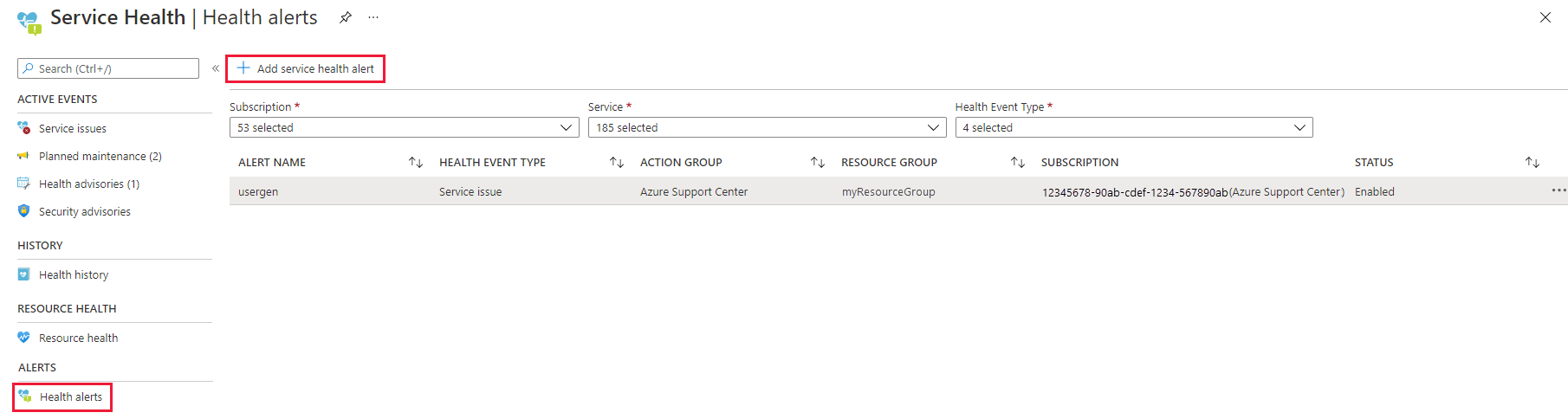 2. To create a new alert, select Add service health alert at the top of the page.