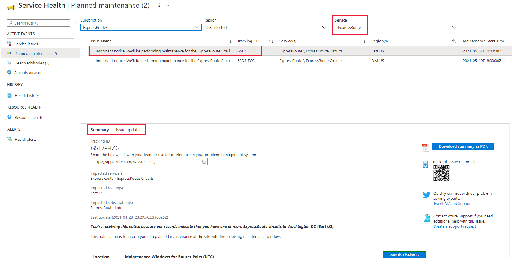 Screenshot of ExpressRoute maintenance summary.