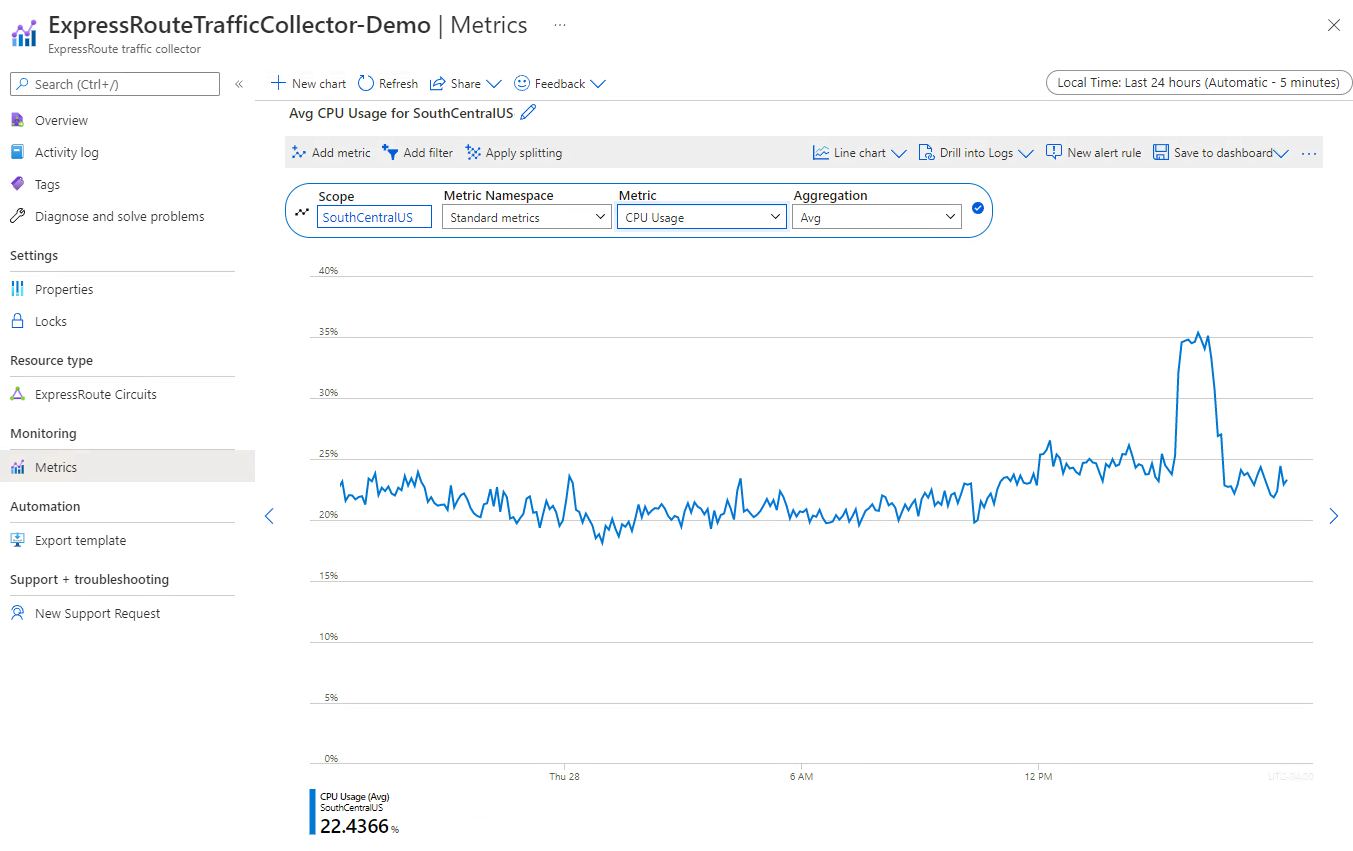 You can view the CPU utilization of each ExpressRoute Traffic Collector instance. The CPU utilization might spike briefly during routine host maintenance, but prolonged high CPU utilization could indicate your ExpressRoute Traffic Collector is reaching a performance bottleneck.