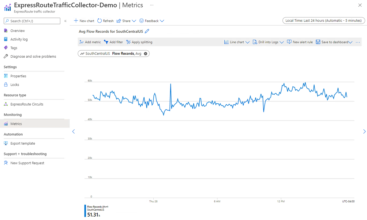You can view the count of number of flow records processed by ExpressRoute Traffic Collector, aggregated across ExpressRoute Circuits. You can split the metrics across each ExpressRoute Traffic Collector instance or ExpressRoute circuit when multiple circuits are associated to the ExpressRoute Traffic Collector. Monitoring this metric helps you understand if you need to deploy more ExpressRoute Traffic Collector instances or migrate ExpressRoute circuit association from one ExpressRoute Traffic Collector deployment to another.