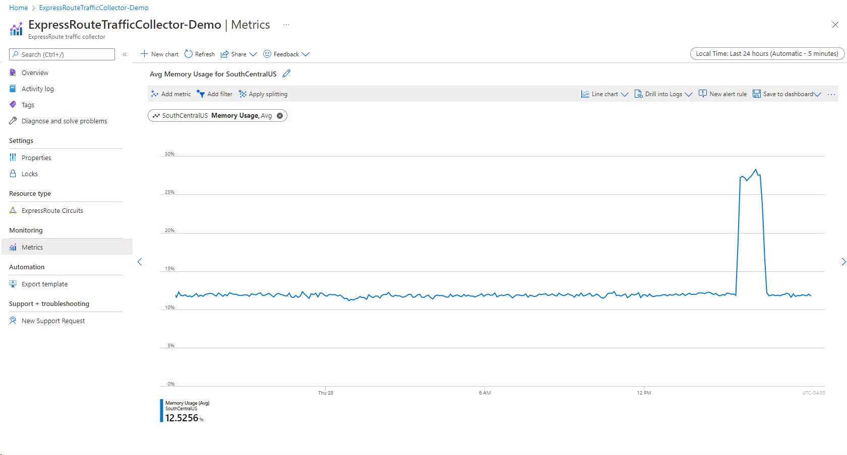You can view the memory utilization of each ExpressRoute Traffic Collector instance. Memory utilization might spike briefly during routine host maintenance, but prolonged high memory utilization could indicate your Azure Traffic Collector is reaching a performance bottleneck.